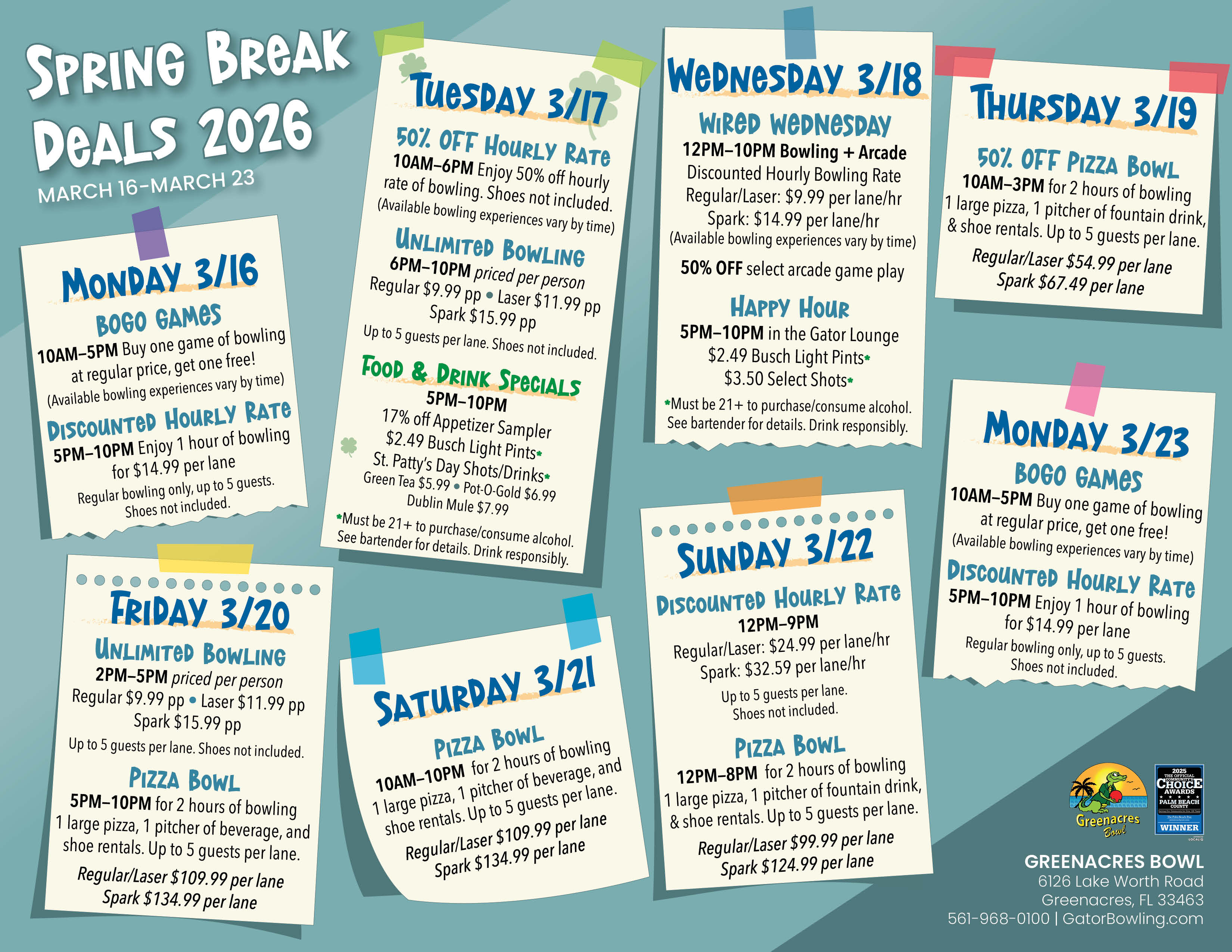 SPRING BREAK DEALS ARE COMING! Join us for the week of 3/16 - 3/23 for discounted bowling rates, specials, diner + lounge deals, and more! View the flyer here: View Spring Break Deals flyer