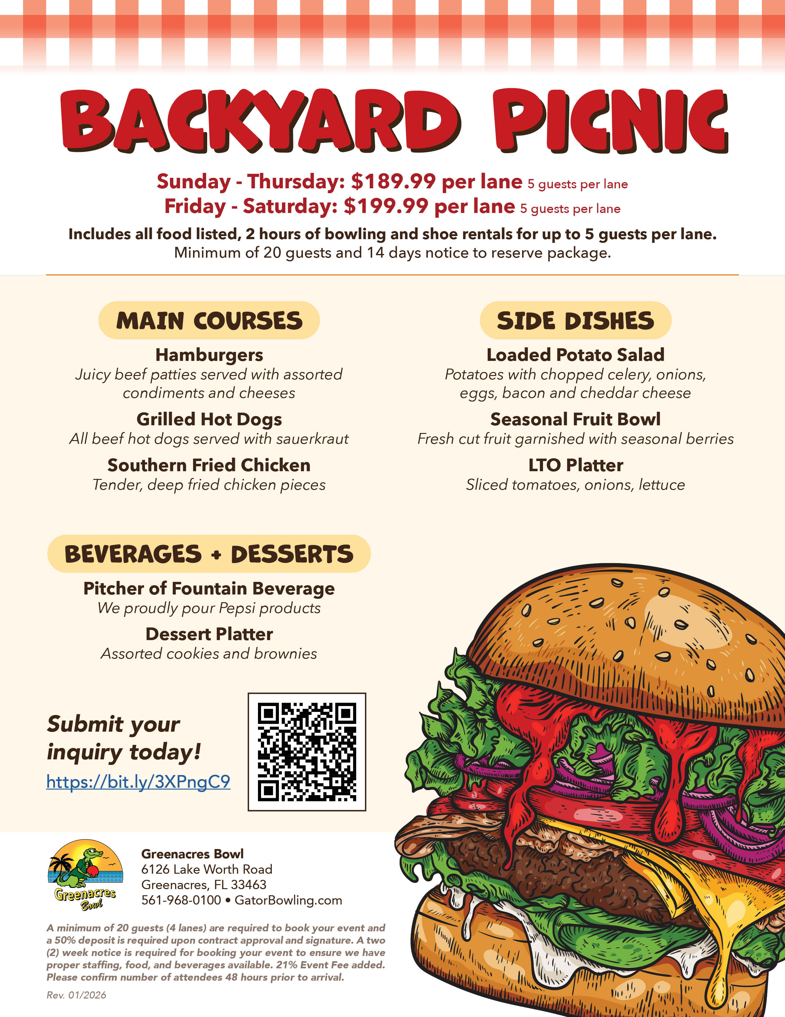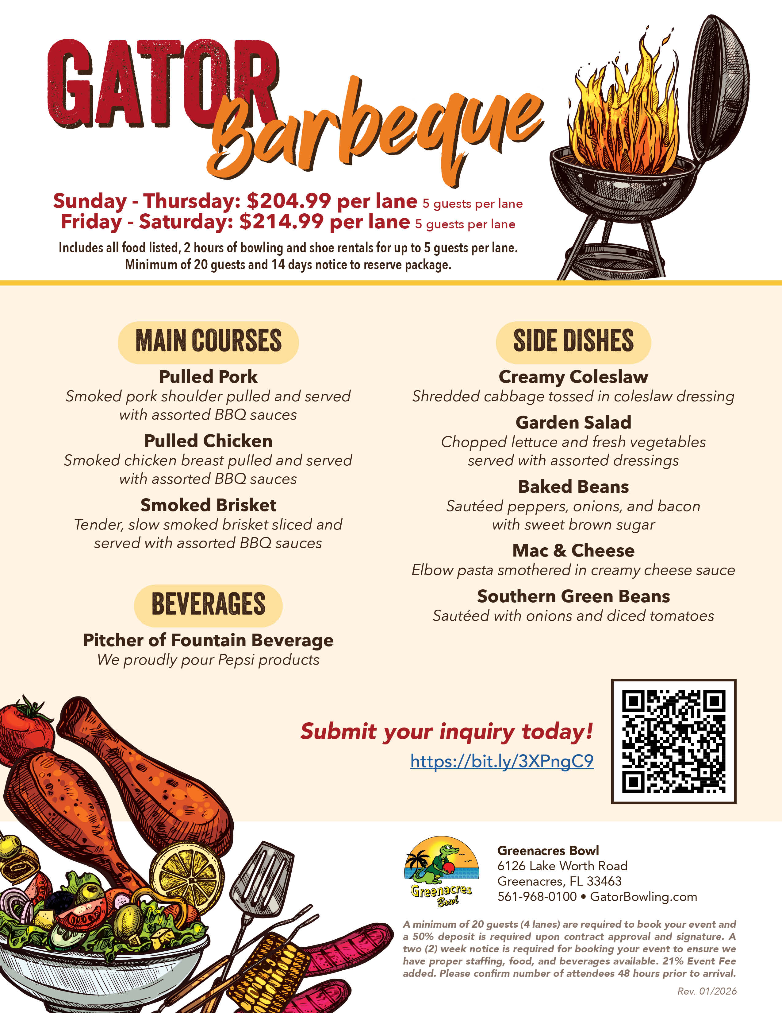 View the flyers for details and pricing. Our office hours are Tuesday through Saturday, 10AM - 6PM, however, you can fill out a Greenacres Bowl Group Inquiry Form any time of day and one of our Event Staff Members will reach out to you within 24 hours! Still have questions or concerns? Please email us at events@gatorbowling.com or call 561-968-0100 to speak with one our event staff.
