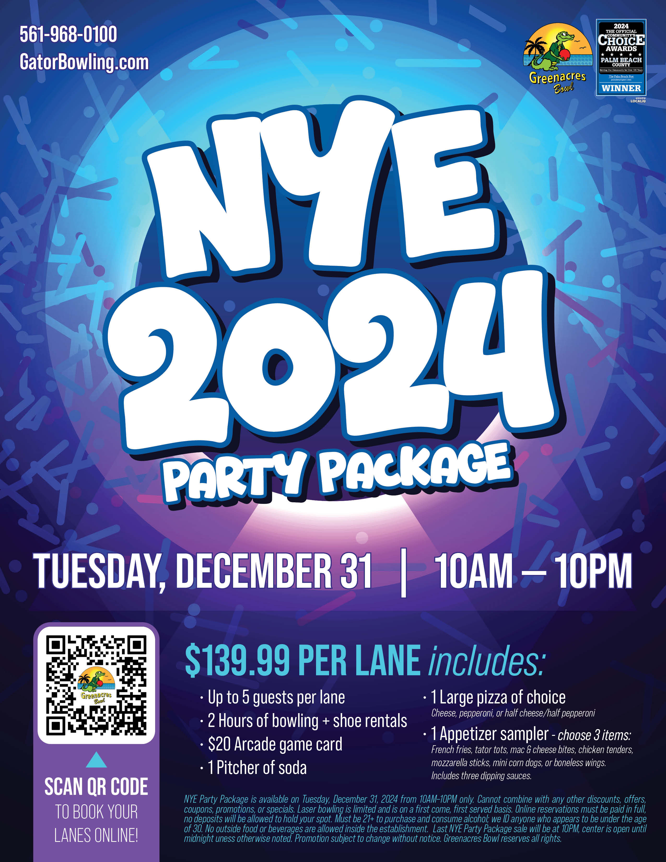 NYE Party Package is available on Tuesday, December 31, 2024 from 10AM–10PM only. Cannot combine with any other discounts, offers, coupons, promotions, or specials. Laser bowling is limited and is on a first come, first served basis. Online reservations must be paid in full, no deposits will be allowed to hold your spot. Must be 21+ to purchase and consume alcohol; we ID anyone who appears to be under the age of 30. No outside food or beverages are allowed inside the establishment. Last NYE Party Package sale will be at 10PM, center is open until midnight uness otherwise noted. Promotion subject to change without notice. Greenacres Bowl reserves all rights.