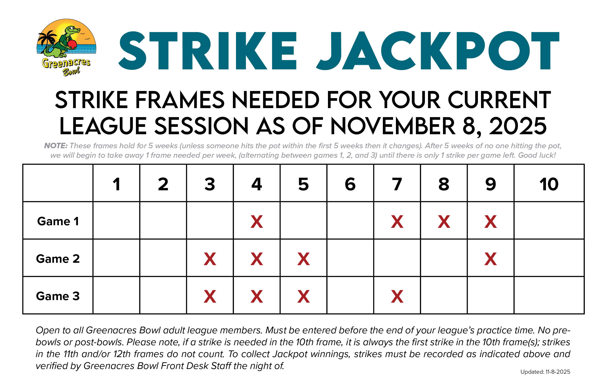 - The Jackpot will start at $100. Entries are $1 each per league session. All Greenacres Bowl adult league members are eligible to participate in the Strike Jackpot.