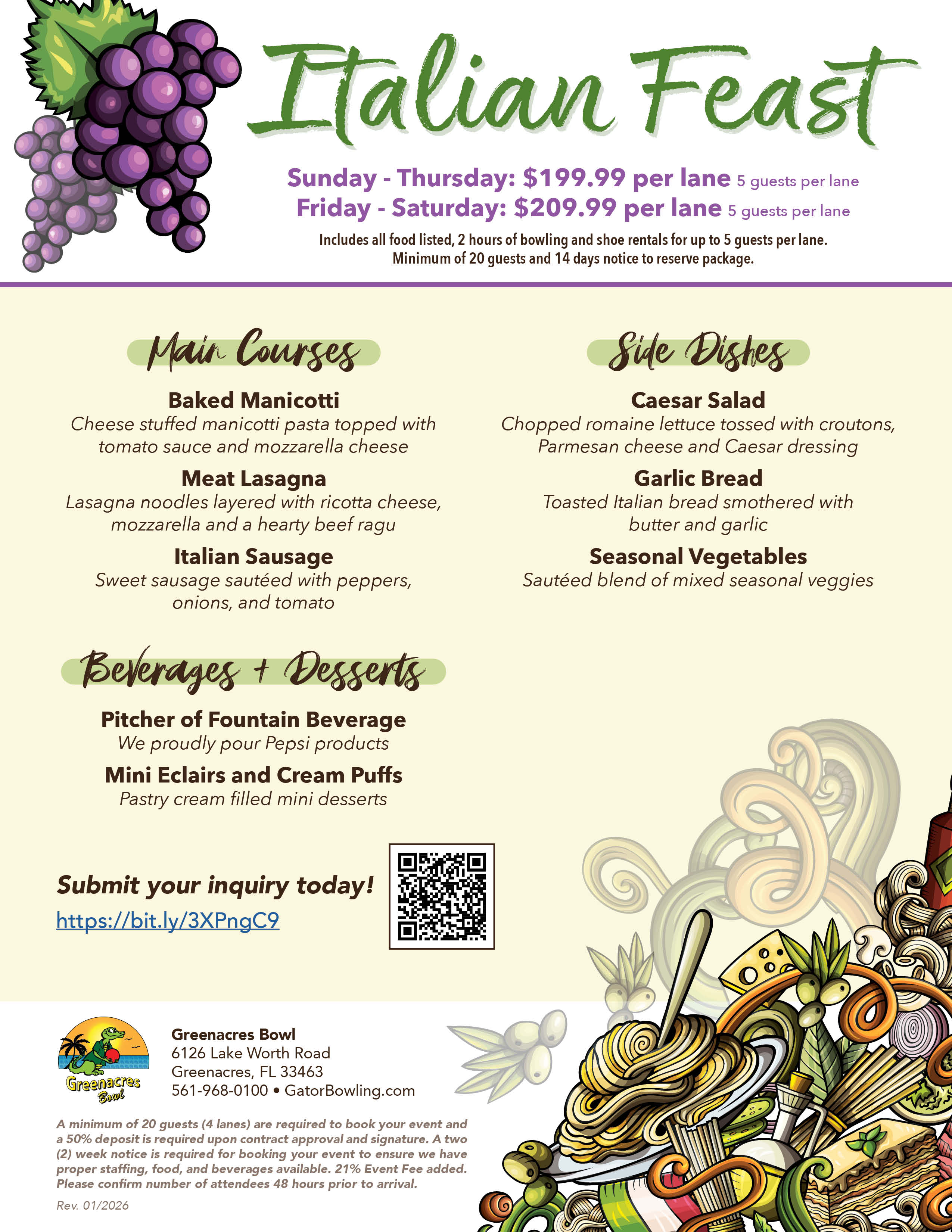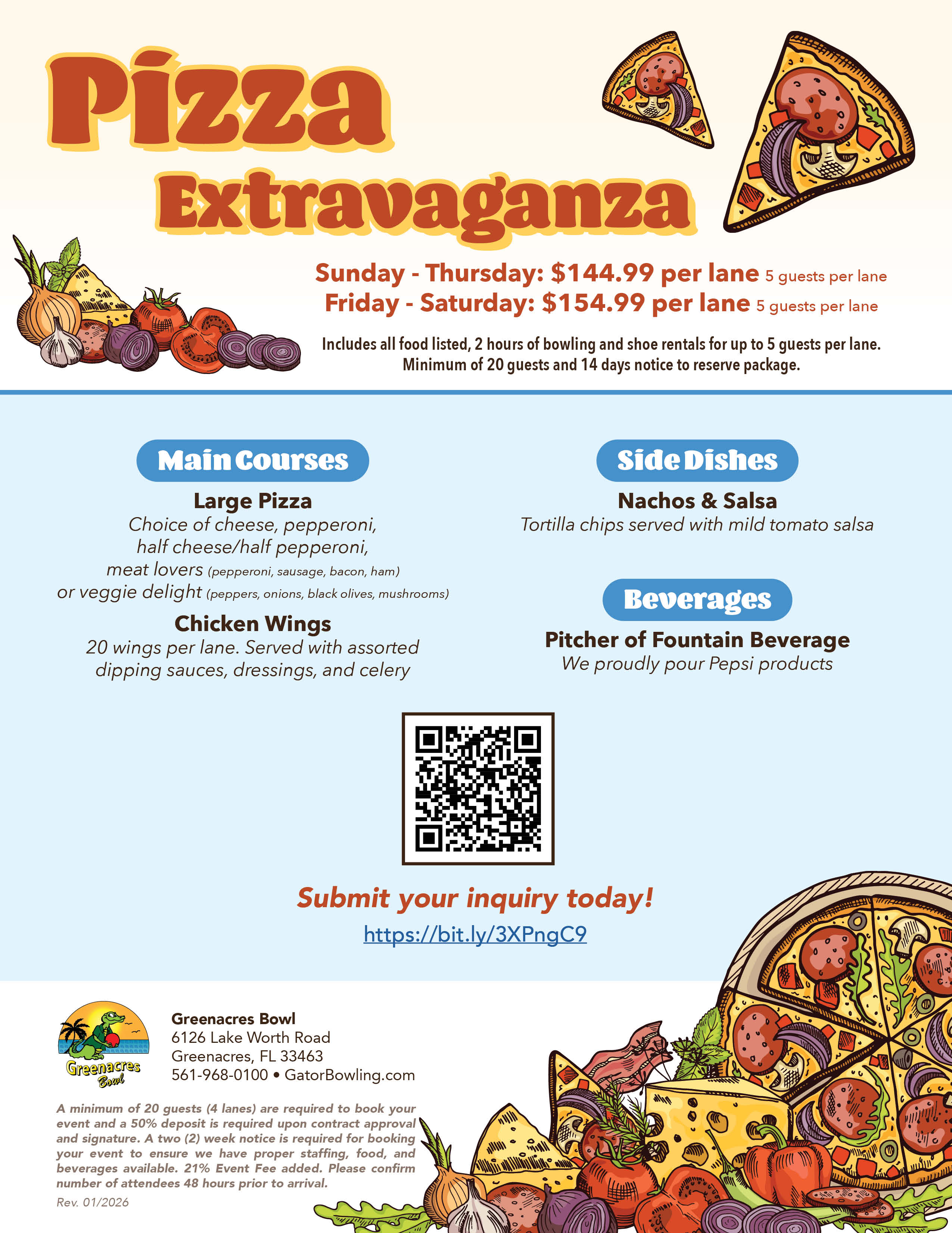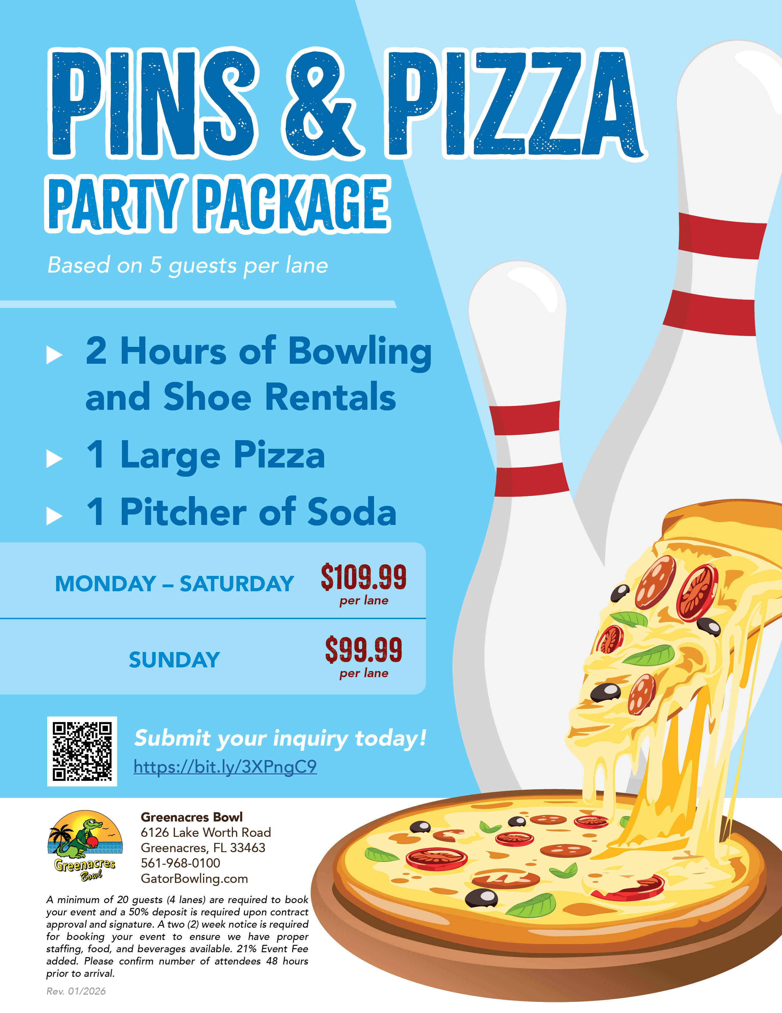 View the flyers for details and pricing. Our office hours are Tuesday through Saturday, 10AM - 6PM, however, you can fill out a Greenacres Bowl Group Inquiry Form any time of day and one of our Event Staff Members will reach out to you within 24 hours! Still have questions or concerns? Please email us at events@gatorbowling.com or call 561-968-0100 to speak with one our event staff.