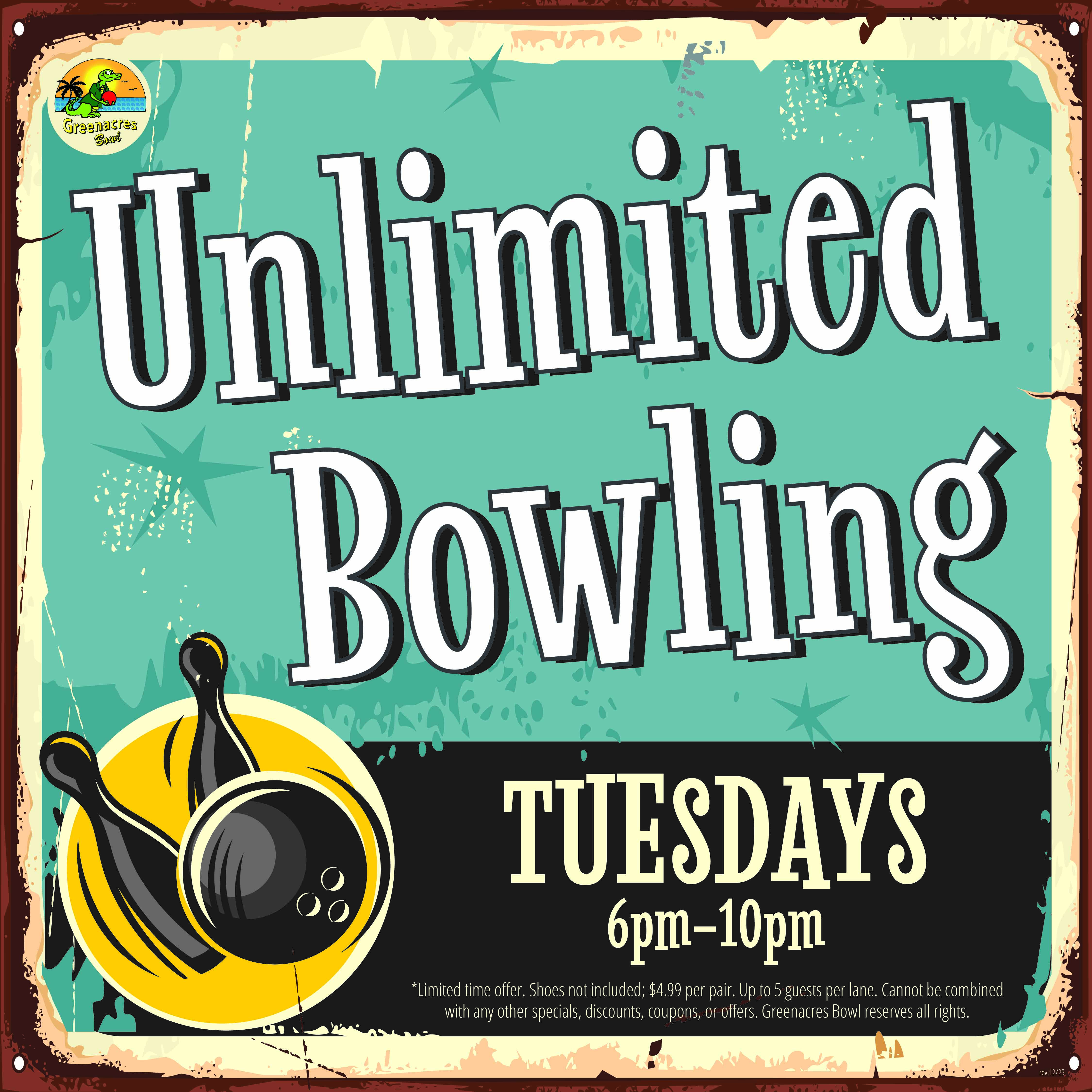 *Limited time offer. Up to 5 guests per lane. Cannot be combined with any other specials, discounts, coupons, or offers. Must be 21+ to purchase and consume alcohol. We ID anyone who appears to be under the age of 30. Greenacres Bowl reserves all rights.